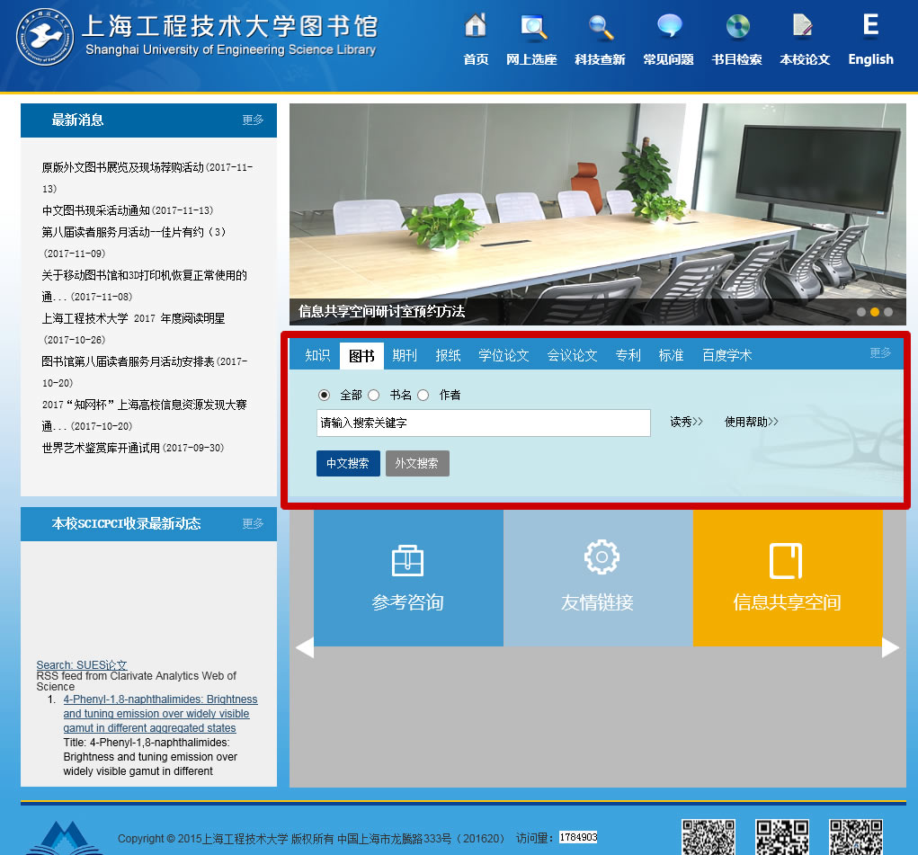 “讀秀”是由海量全文數據及資料基本信息組成的超大型數據庫,為用戶提供深入到圖書章節和內容的全文檢索、部分文獻的原文試讀、以及高效查找、獲取各種類型學術文獻資料的一站式檢索。該平臺整合了紙質圖書、電子圖書、電子期刊、會議論文、學位論文、報紙、專利、標準以及互聯網免費資源等。通過這個平臺,讀者可以遠程訪問、無縫獲取所需信息和服務,更為有效地利用圖書館提供和揭示的信息資源。讀者可在圖書館主頁上看到以下信息檢索界面。