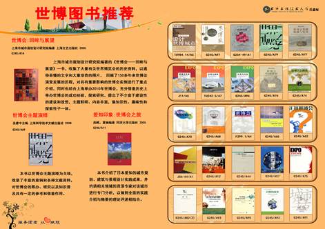 其次,為切合世博主題,我們精心挑選了一些有關世博的圖書,并對每本圖書進行了詳細的介紹,方便讀者全面了解世博。同時,我們在圖書館第一借閱室設立了世博圖書專架,并放在借閱室的顯要位置,方便讀者找到與世博相關的書籍,及時了解世博相關知識。